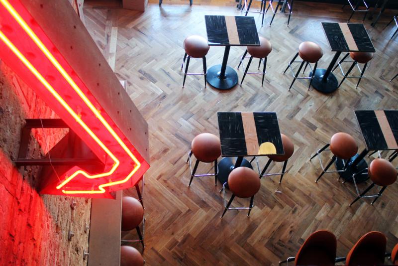 The client's concept was a space with a coffee shop, restaurant, bar all under one roof. Our initial design decision was to install a classic herringbone floor, to soften the industrial feel and give the space an unexpected refined detail. We discovered the antique Ethyl and Tank (working!) neons serendipitously in the beginning stages of this project as well. They came from a truck stop in Georgia that was being demolished. We proposed the name to change from Raging Bull, to Ethyl and Tank. We liked the idea of doing our own take on a one-stop spot, and imagined Ethyl and Tank to be that “hub” on the oasis of Ohio State University.